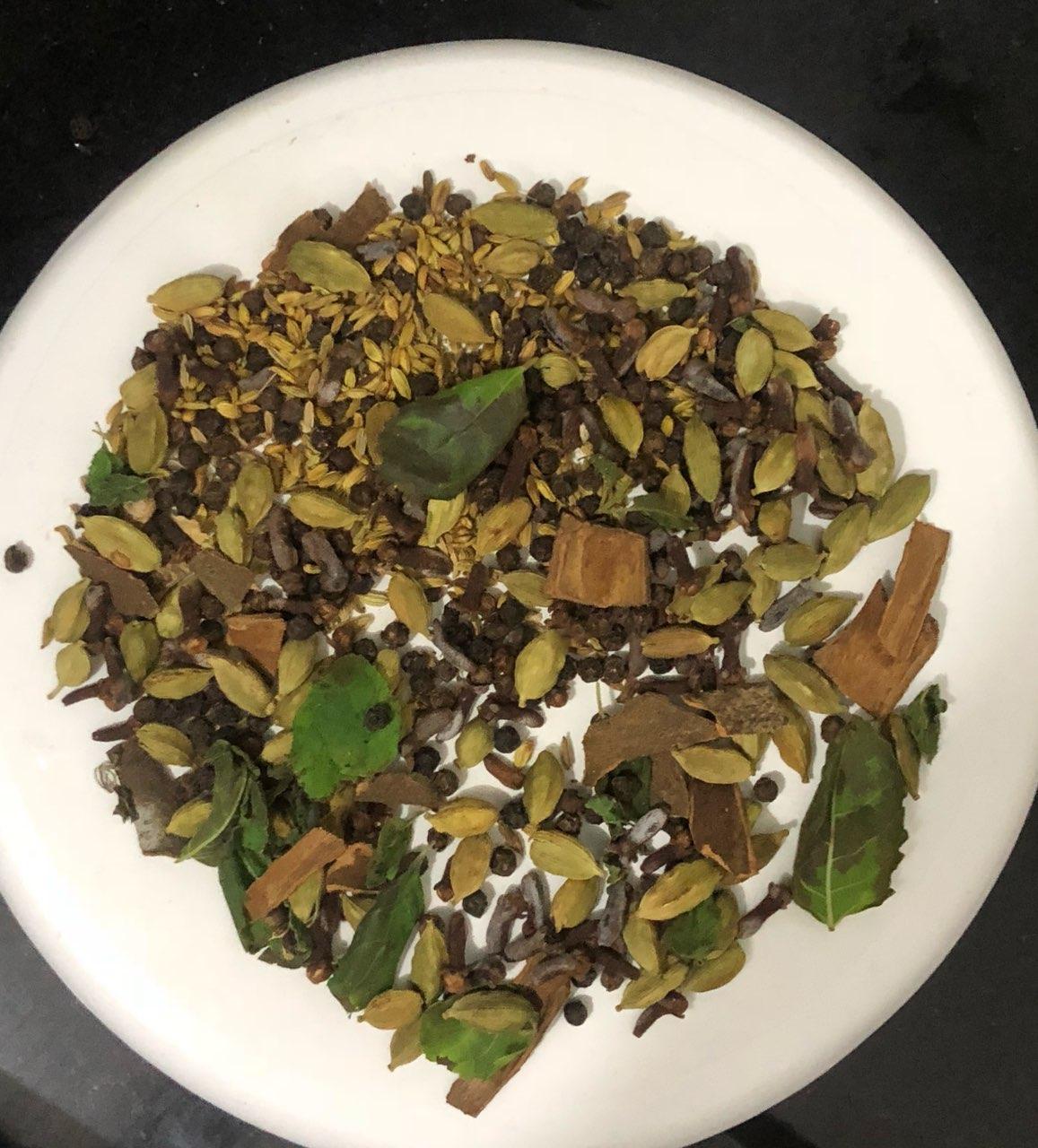 5 ) अंत में तुलसी पते डालकर इन सभी साबुत मसालों को एक ही मिनट के लिये भूने जैसे ही मसालों की महेक आने लगे गैस को बंद कर दीजिए।