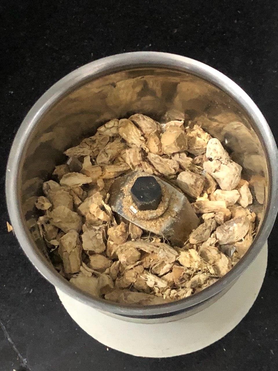 7 ) अब mixer jar me पहेलेसोंठकोबारीकपिसले। इससोंठके powder को एक कटोरी में डाले।