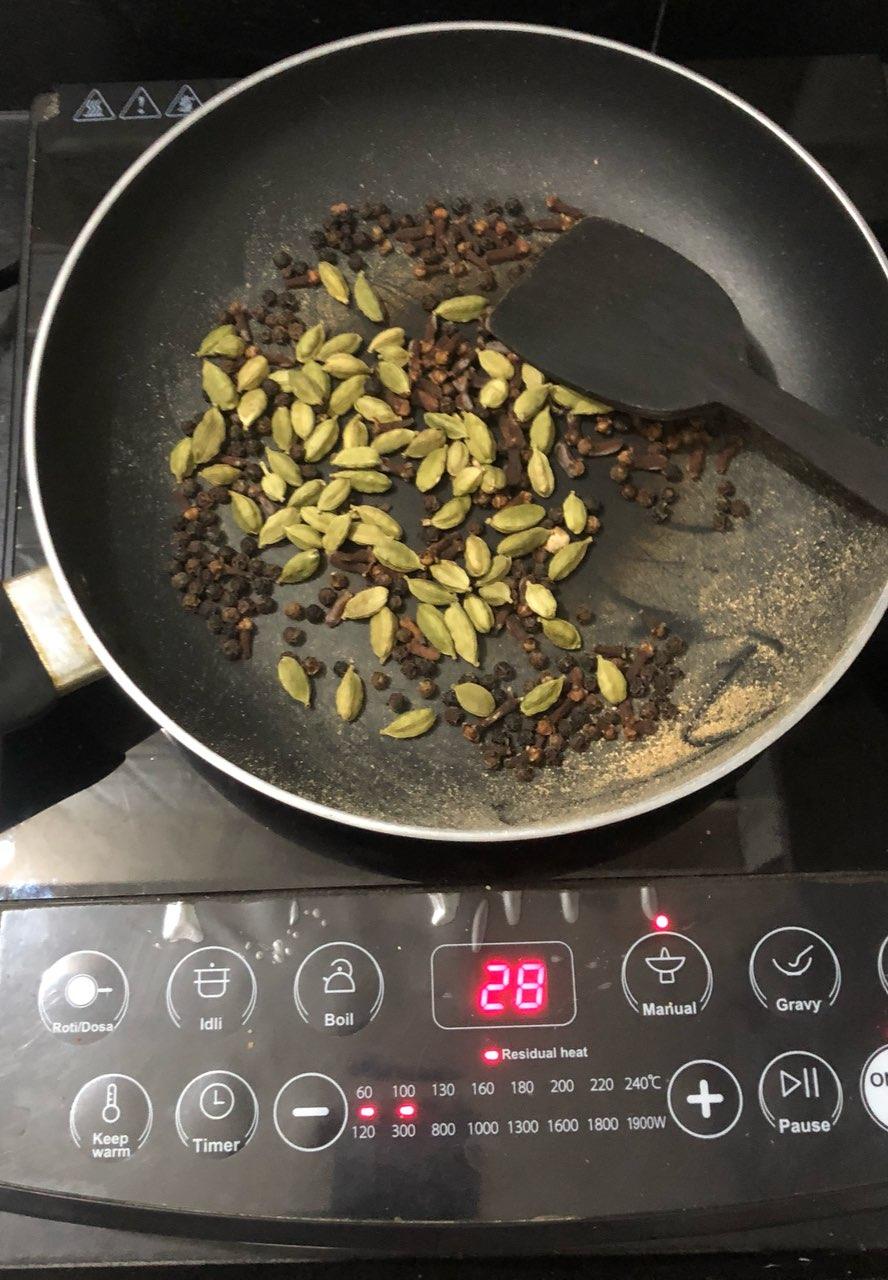 3) उसी पैन में लौंंग, काली मिर्च और इलायची डालकर ह्ल्कासा सेंके।