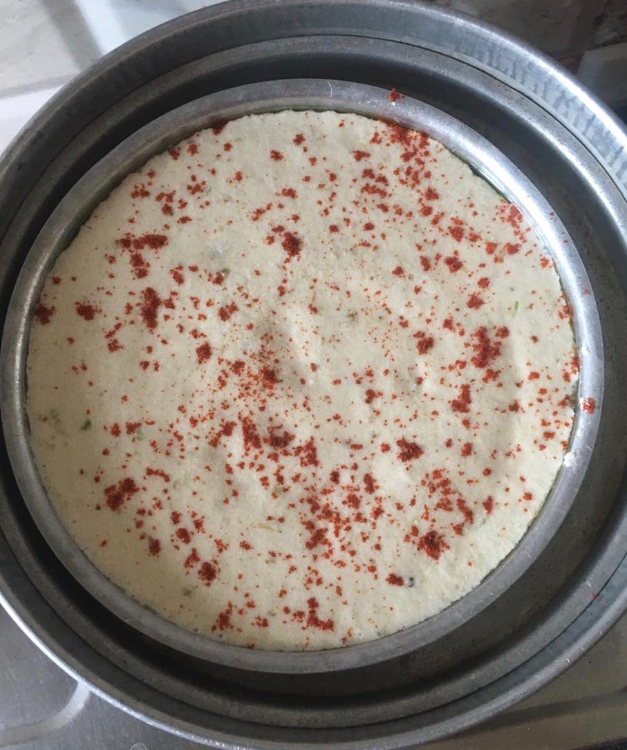 6) अब  फूलकर  तैयार  किये  हुए  ढोकला  बेटर  में  से  आधा  बेटर  ले, इसमें  1 tsp oil  और  1/4tsp बेकिंग सोडा  डालें  और  एक  ही  डायरेक्शन  में  फेंटकर  तुरन्त  ही  तेल  से  चिकनी  की  हुई  थाली  में  डालकर  फेलाए । फिर बेटर  से  भरी  इस  थाली  को  तुरंत  ही  स्टीमर  पे  रखे  (अगर आप चाहे तो) इसके  ऊपर  लाल मिर्च पाउडर  छिड़क  दीजिये ।