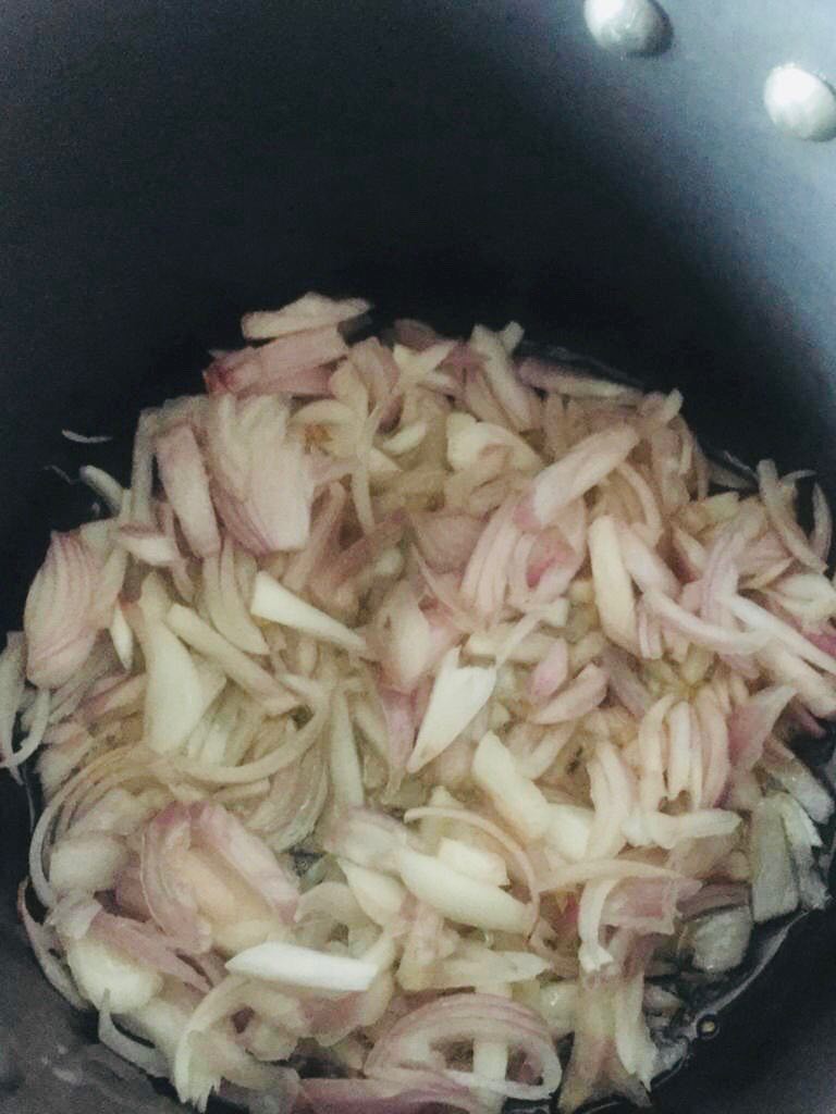 5) अब गैस पे प्रेशर कुकर को गरम होने के लिए रखें, इसमें तेल डालें, तेल गरम होने पर लहसुन अदरक का पेस्ट डालें, फिर इसमें लम्बी कटी हुई प्याज़ डालें, प्याज को चलाते हुए हल्का गुलाबी होने तक भूने ।