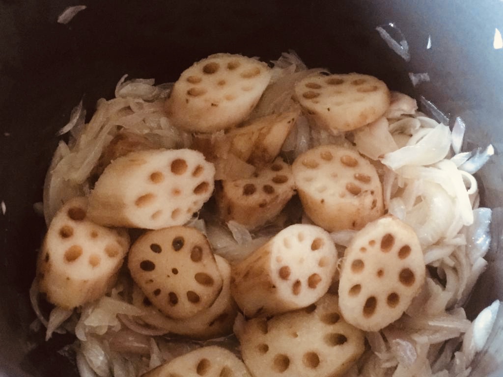 6) जब प्याज हल्का गुलाबी हो जाए तब इसमें कटी हुई कमल ककड़ी( bhee) डालकर 2 बड़े चमच्च पानी डालें और कुकर का ढ़क्कन बंध कर दे high फ्लेम पे एक सिटी आने तक पकने दें, फिर गैस की आँच धीमी कर दे,और 4 से 5 मिनिट तक पकने दे फिर गैस को बंद कर दे।