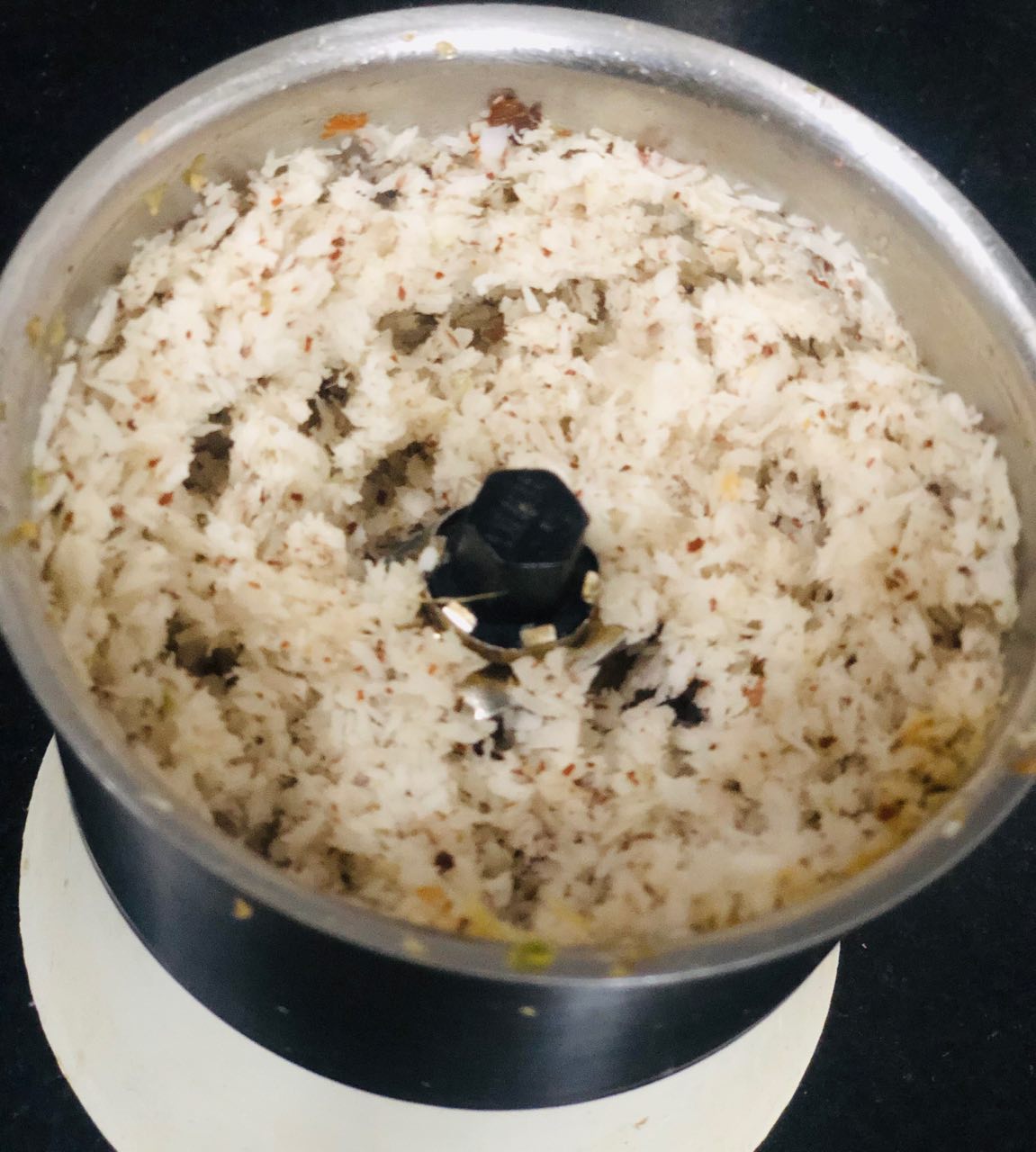 1) मिक्सर का छोटा चटनी जार लें, इसमें कटे हुए ताजा नारियल के टुकड़े डालकर दरदरा पीस लीजिए।
