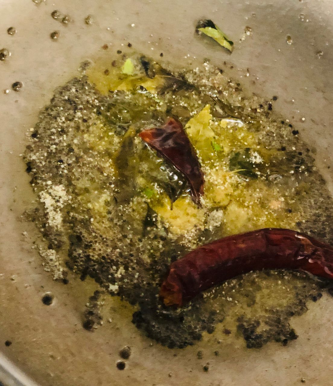 2) जब राई तड़कने लगे तब हींग, साबुत लाल मिर्च और करी पत्ते डाल दीजिए, अच्छी तरह से मिलाएं, गैस बन्द कर दीजिए।