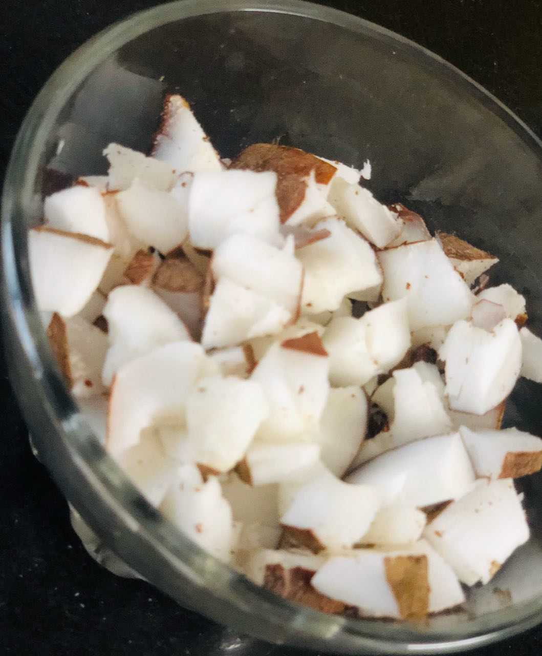 1) नारियल को छोटे छोटे टुकड़ों में काट लीजिए।
