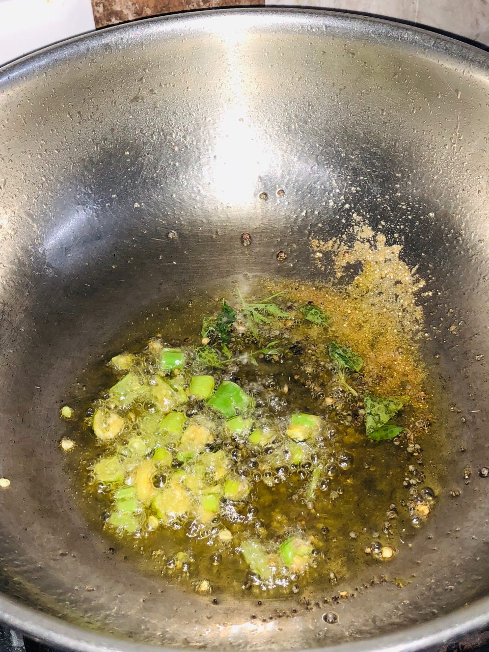 1) एक कड़ाई या गहरे नॉन-स्टिक पैन में मध्यम आंच पर तेल गर्म कीजिए। 2) तेल के गरम होने पर राई डालें, जब राई फूटने लगे हींग, करी पत्ते और हरी मिर्च डालें, मिर्ची के कुरकुरी होने तक पकाए। (इस स्टेप पे लगभग 20 से 30 सेकंड का समय लगेगा)