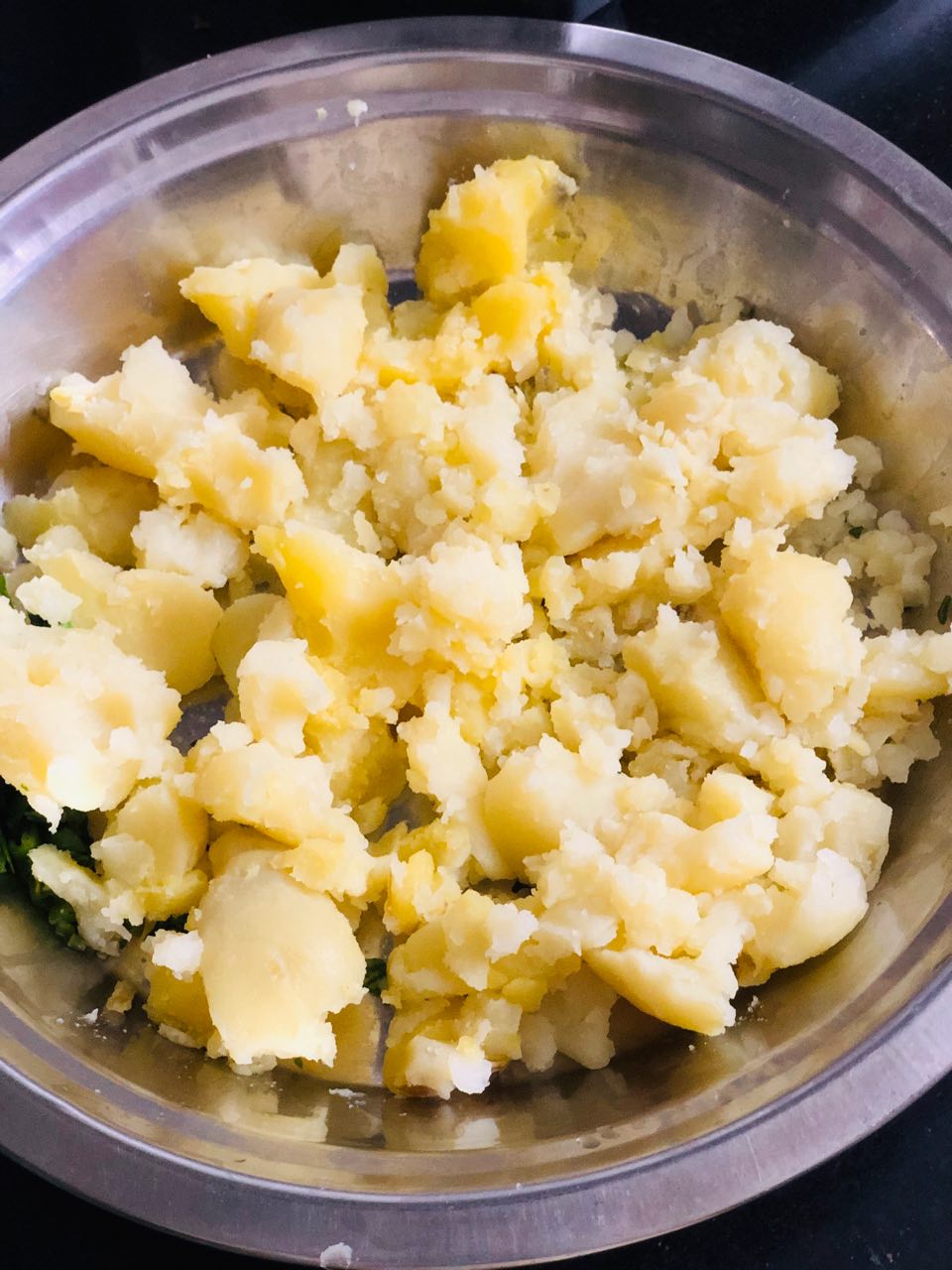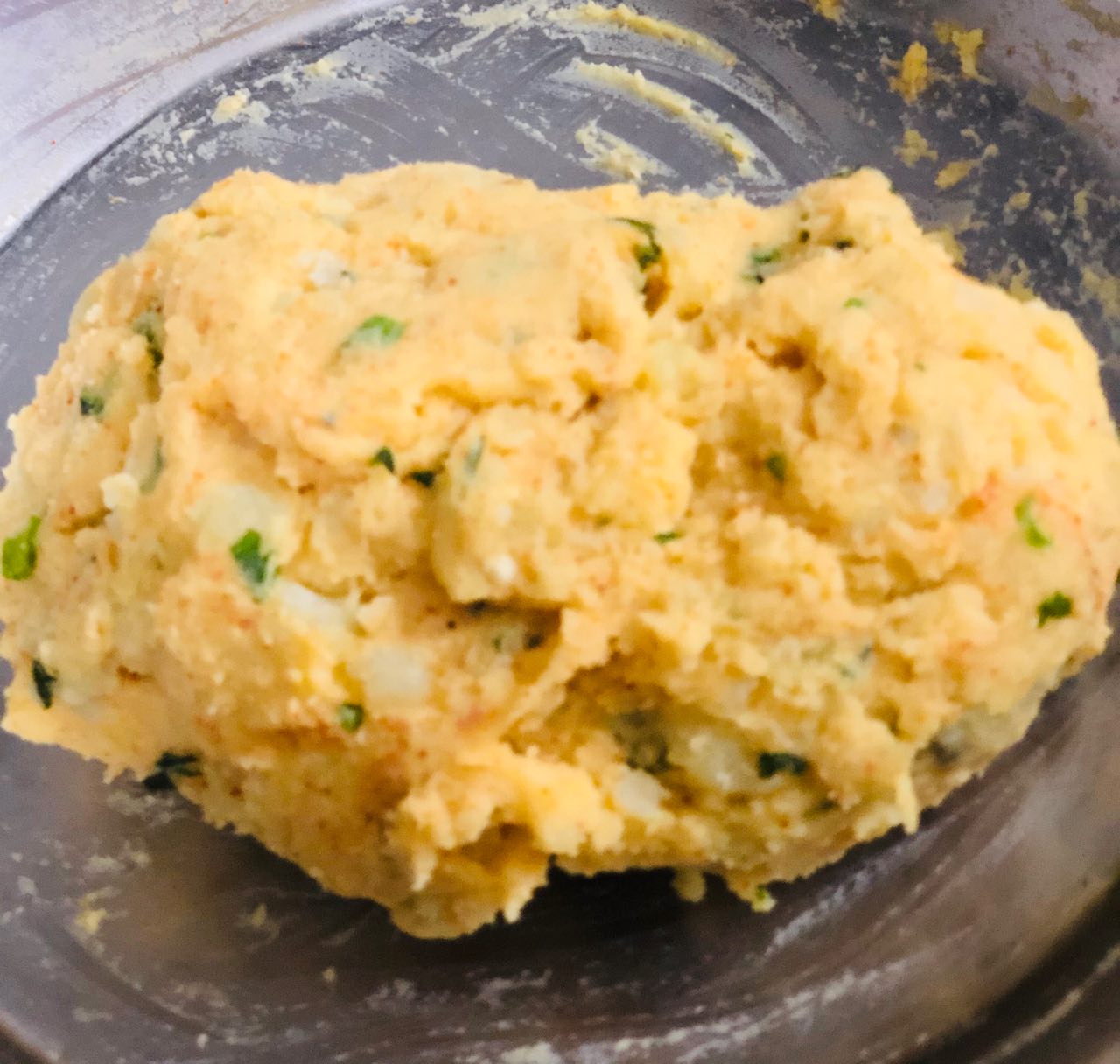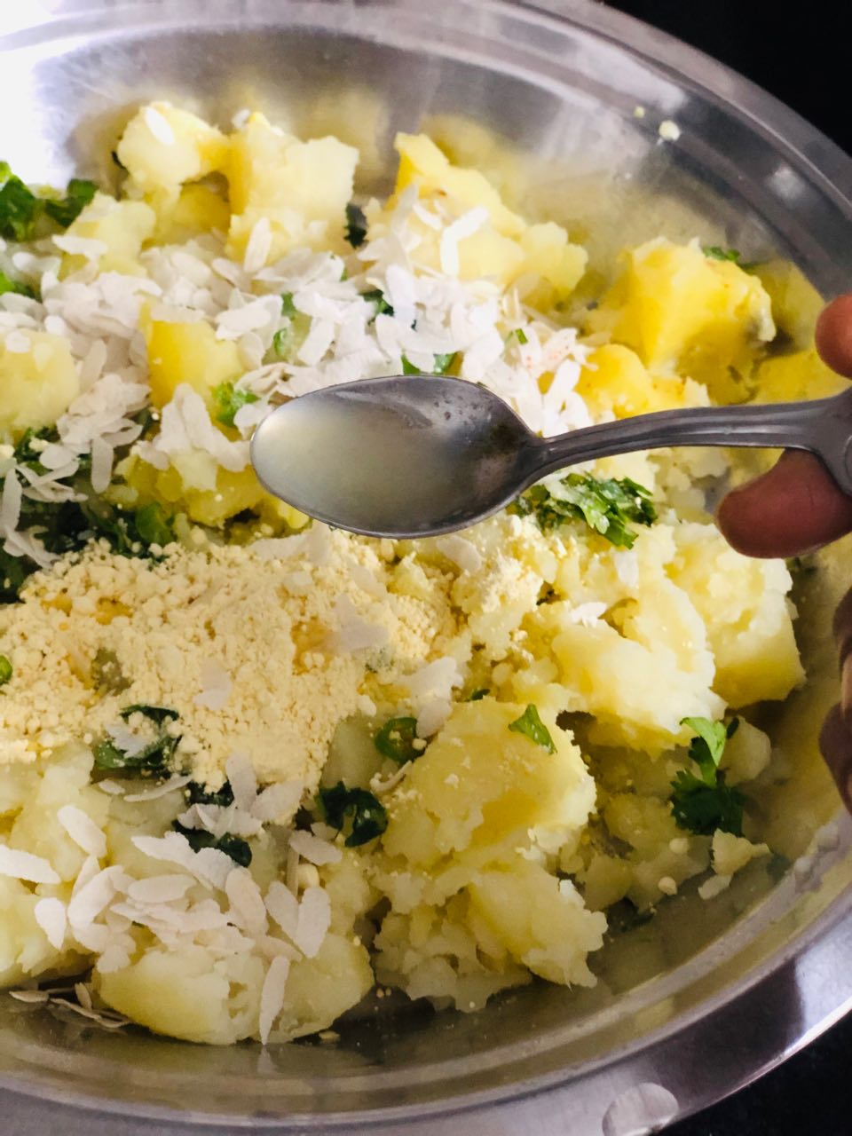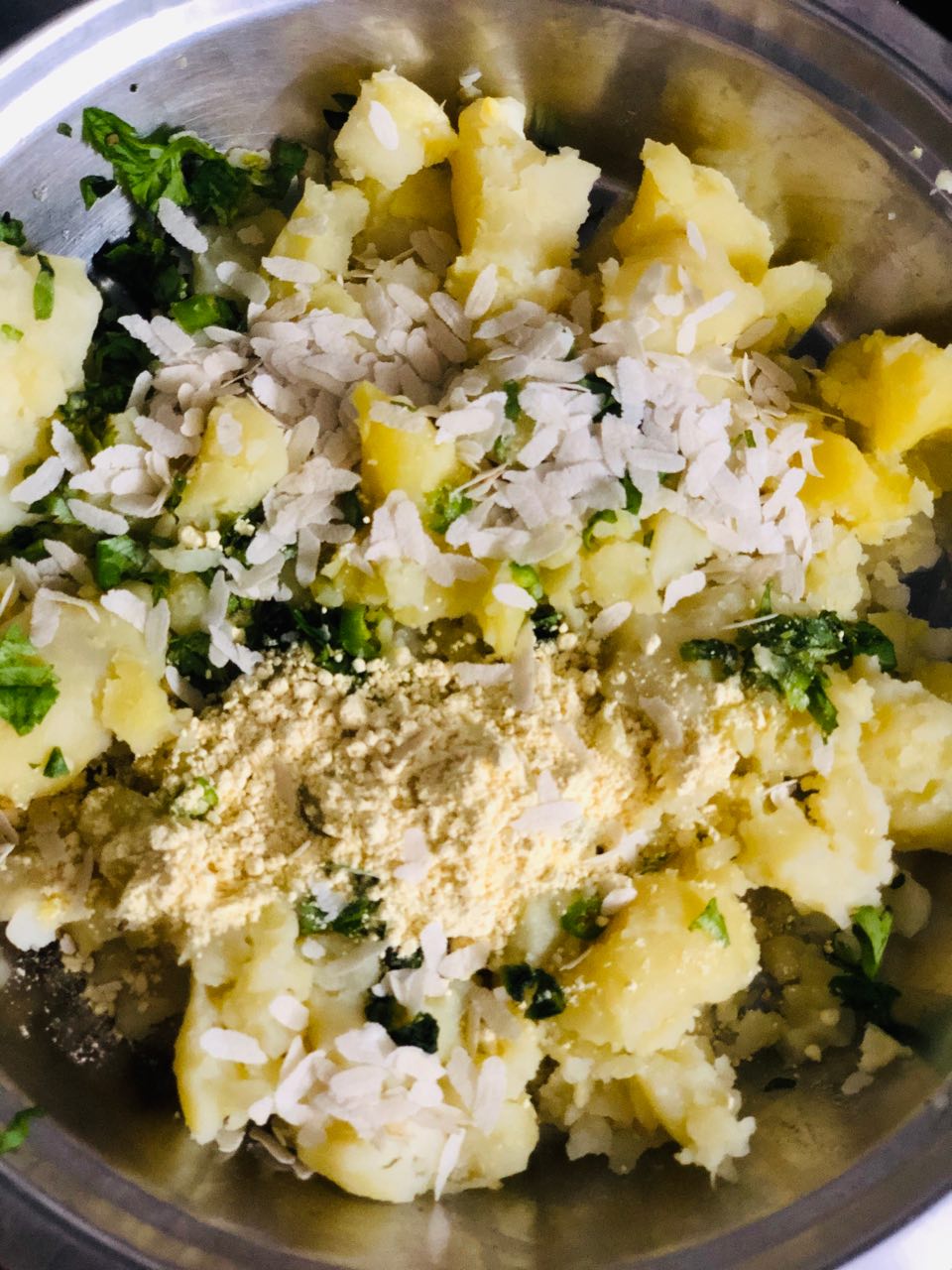 2) मसले हुए आलू में हरा धनिया, हरी मिर्च, पोहा और बेसन डालें।