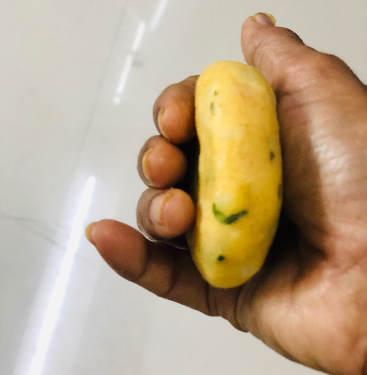 9) इस गोले को अपनी हथेलीयो के बीच से हल्का सा दबाकर चपटा कर दीजिए।
