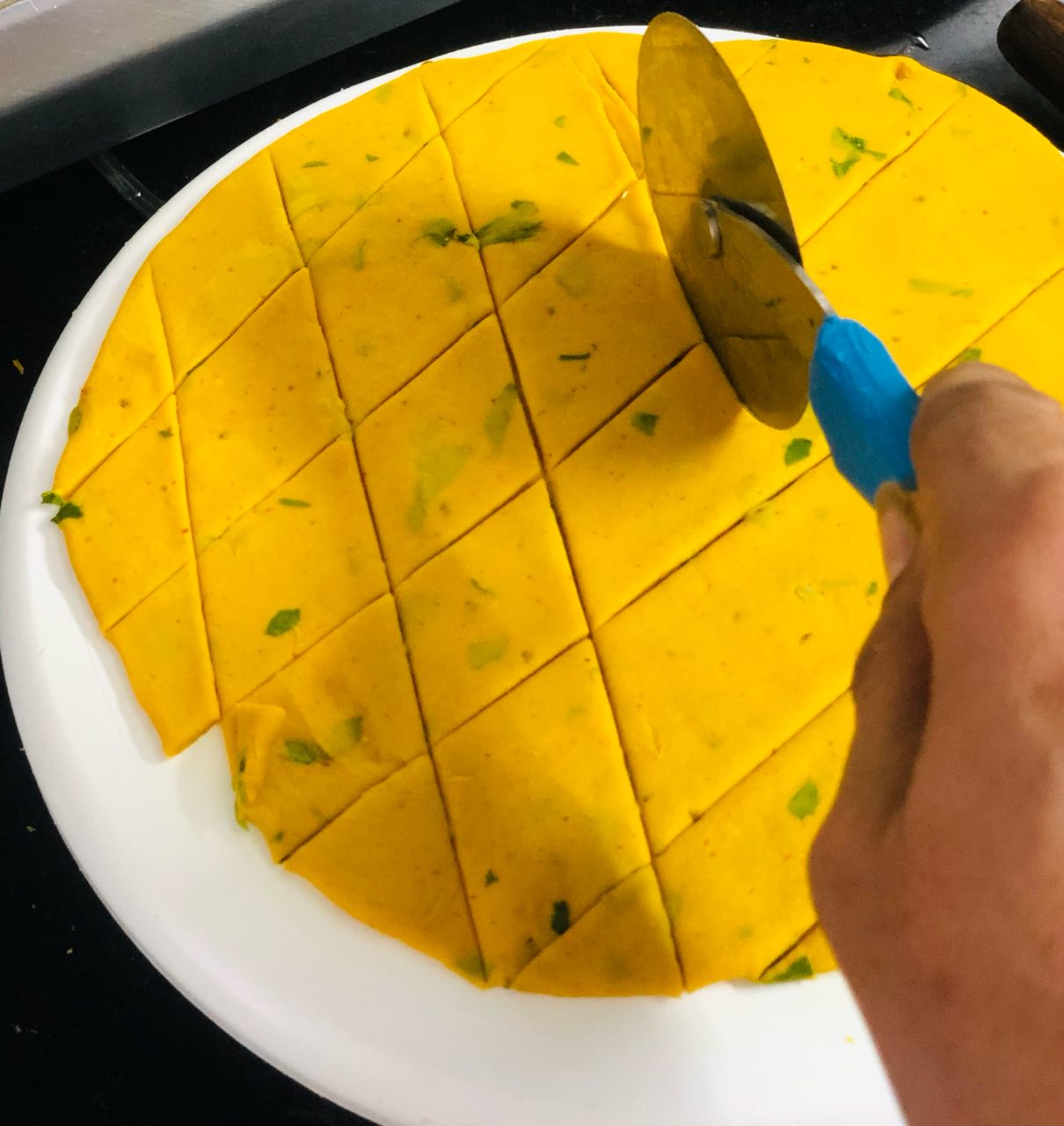 | CUT THE DHOKLI INTO DIAMOND SHAPED PICES |
