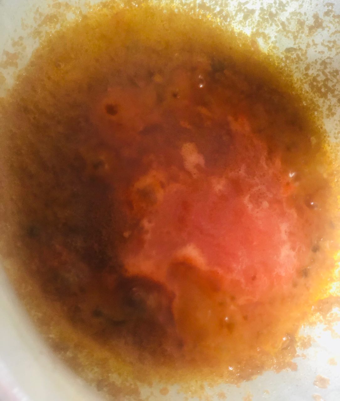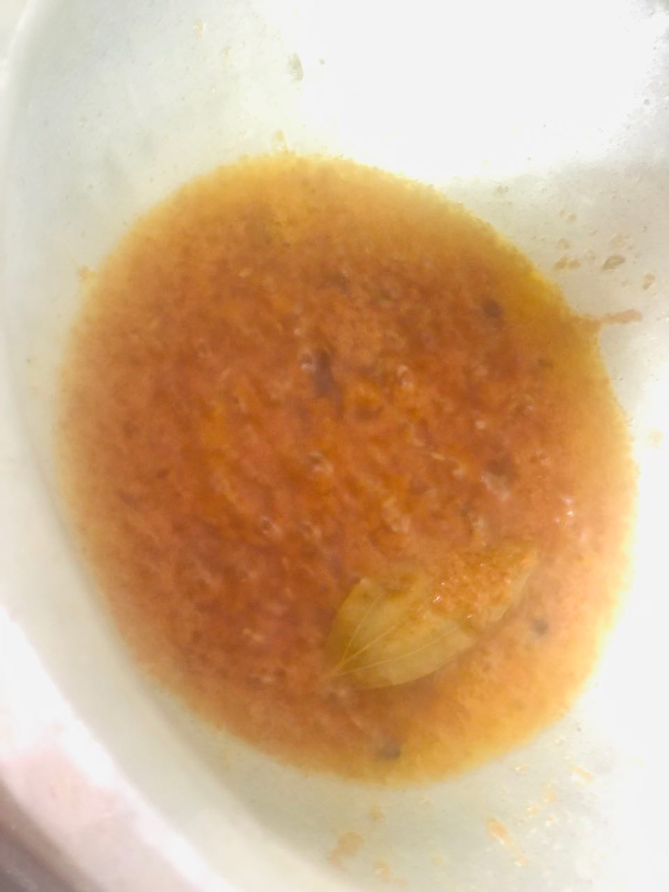 6) टमाटर पेस्ट डालें और मिश्रण में से तेल छूटने तक भुने।
