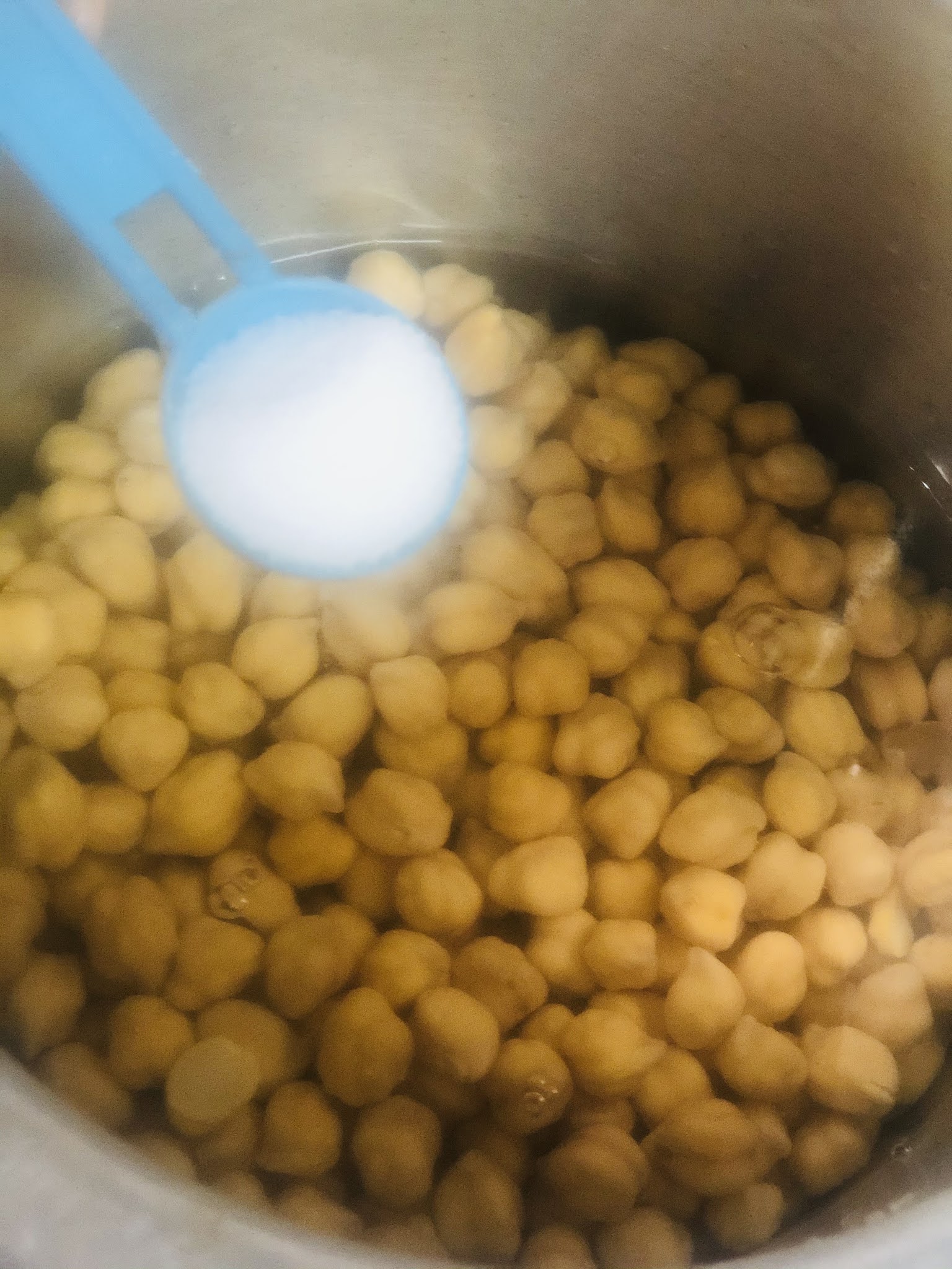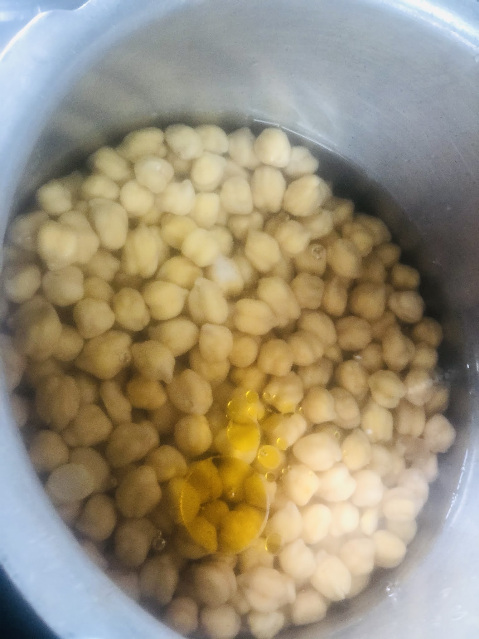 1) 8-10 घण्टे बाद भिगोए हुए काबुली चना में से पानी निकाल लें, इन्हें एक प्रेशर कुकर में डाले, फिर इसमें 2.5 कप पानी, 1tsp तेल, बेकिंग सोडा और नमक डालें।(चने पानी में अच्छे से डूब जाए उतना पानी डाले।)