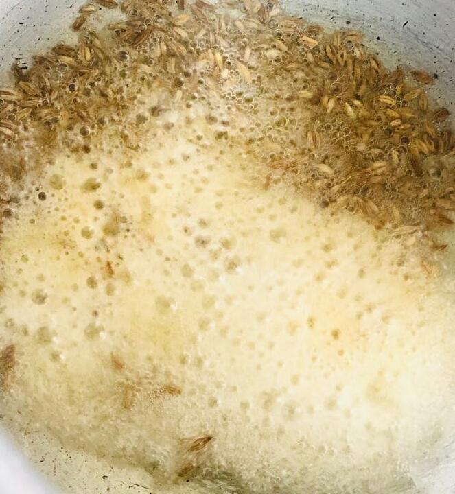 2) तेल के मध्यम गर्म होने पर जीरा डालें, जीरा के हल्का ब्राउन होने पर हींग डाले।