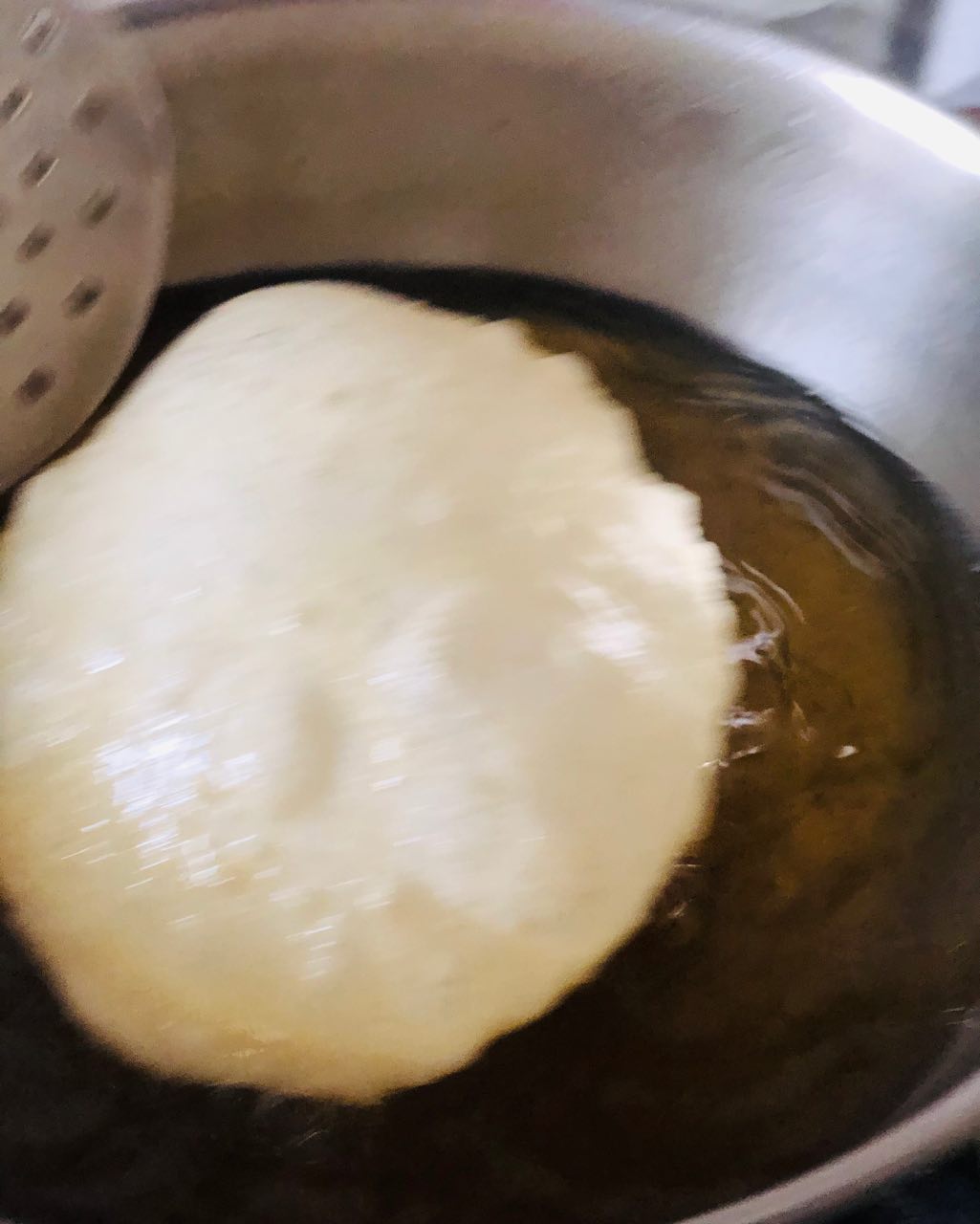 | LIGHTLY PRESS GENTLY THE EDGES OF THE BHATURA WITH THE SLOTTED SPATULA OR SPOON TO PUFF UP |