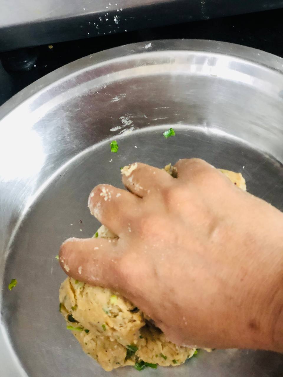 ● ध्यान रखें कि आटे को ज्यादा मसलकर नहीं गूँथना हैं, सिर्फ सारी चीजे इकट्ठी होकर mix हो जाए और गूँथे हुए आटे के form में बंध जाऐं इतना ही गूँथना हैं।