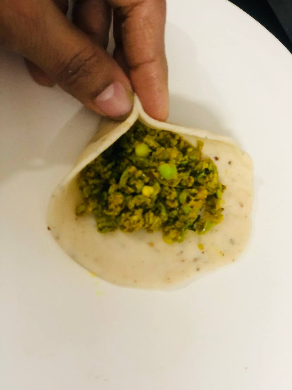 | PLACE 2tbsp OF PREPARED STUFFING IN THE CENTER OF THE POORI |