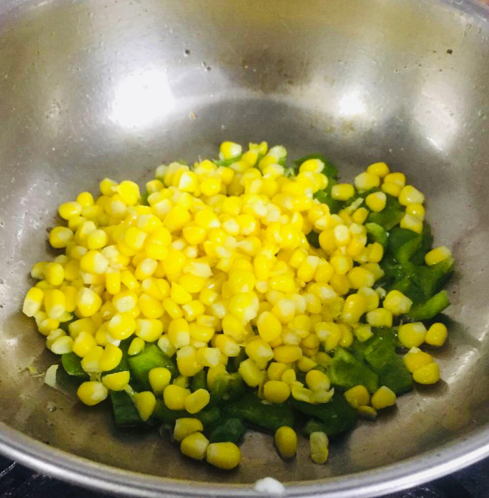 3) जैसे ही शिमला मिर्च सुकडने लगे मकाई के दाने डाल दीजिए, 1/4tsp नमक डालें, अच्छी तरह मिक्स कर दीजिऐ।(1-2 मिनट तक चलाते हुए पकाऐं।)