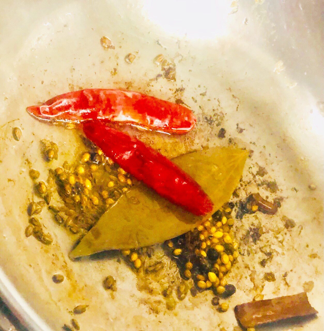5) तेज पत्ते, लौंग, साबुत धनिया के बीज, सबूत लाल मिर्च और साबुत काली मिर्च डाल कर 10 सेकंड तक भुने।
