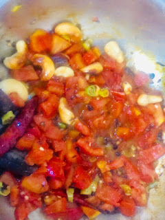 6) कटे हुए टमाटर और काजू डालें, इन्हें सतत चलाते हुए 1-2 मिनट तक भुने।