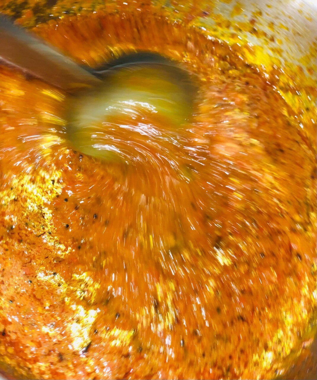 8) अब मिश्रण को सतत चलाते हुए तब तक भुने कि जब तक मिश्रण के ऊपर तेल न तैरने लगे। (इस स्टेप में लगभग 3-4 मिनट का समय लगता हैं।)