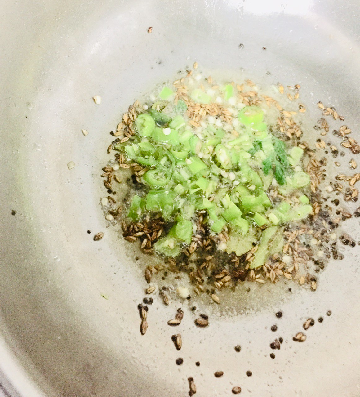 4) जीरा के हल्के ब्राउन होने पर हींग, 1-2 बारीक कटी हुई हरी मिर्च और करी पत्ते ड़ाले और इन्हें हल्का सा भून लीजिए।