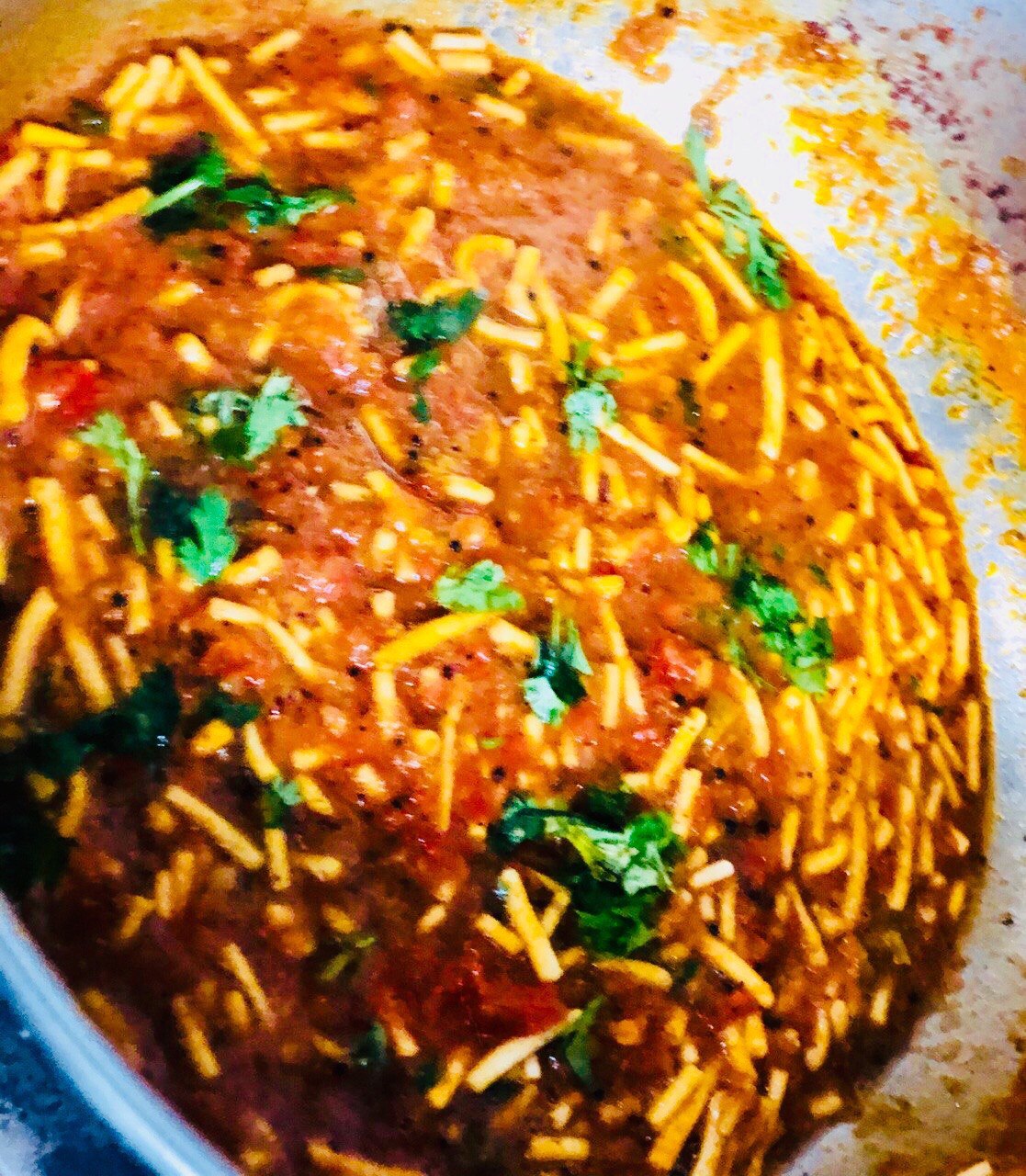 | SEV TAMATAR IS A QUICK, EASY, SPICY & TANGY TOMATO CURRY TOPPED WITH RATLAMI SEV. THIS IS A GOOD OPTION WHEN YOU DO NOT HAVE ANY VEGETABLE AT HOME. |