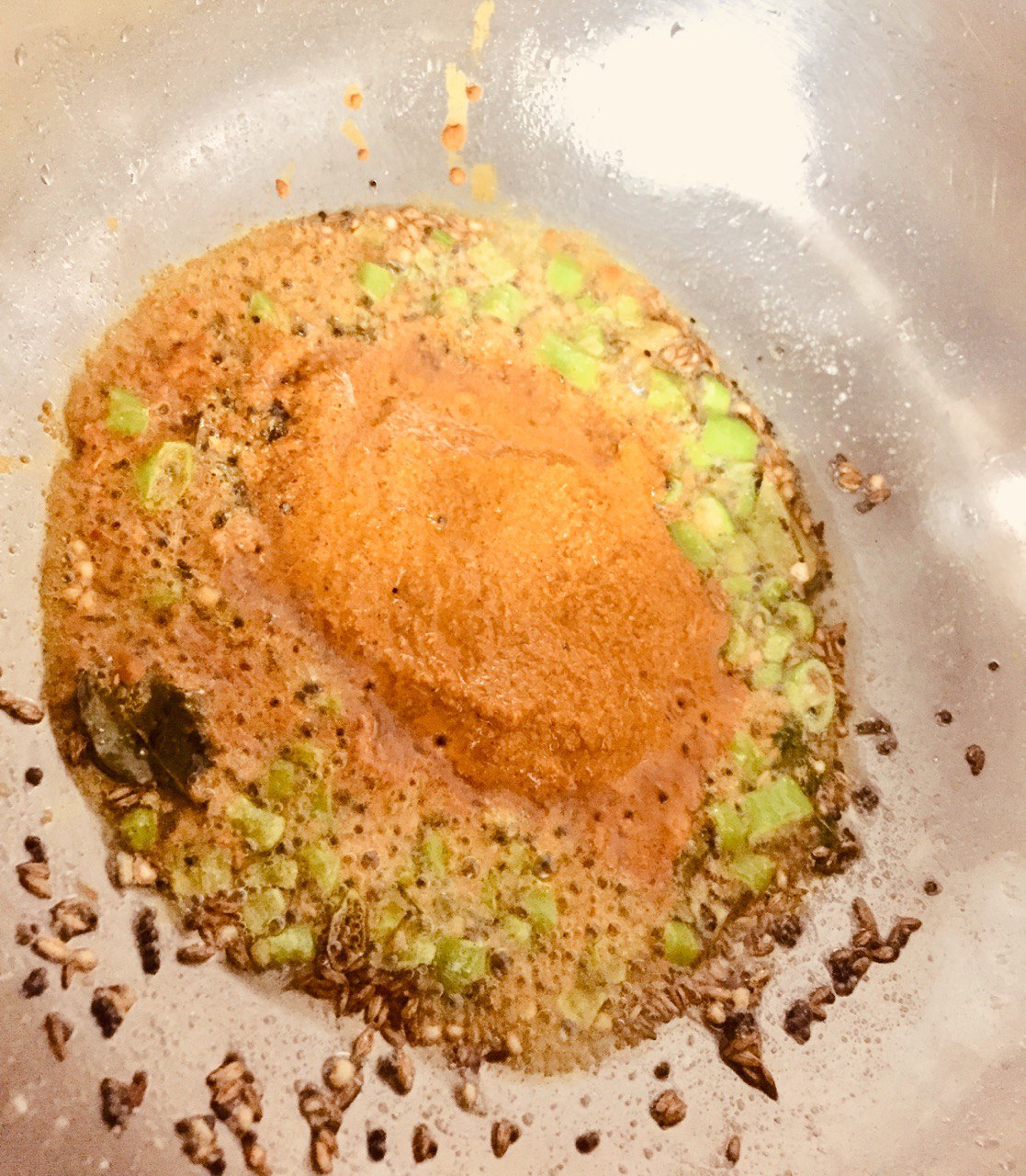 | ADD ASAFOETIDA, FINELY CHOPPED GREEN CHILLIES & CURRY LEAVES |