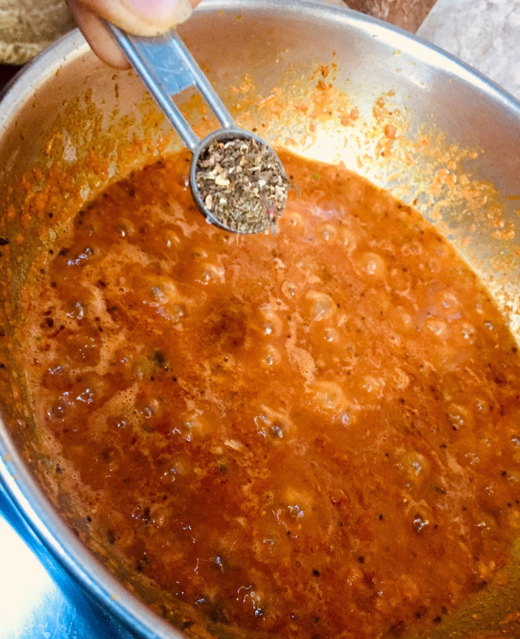 6) 30 सेकंड के बाद पिसकर तैयार की हुई टमाटर पेस्ट डाल दे।
