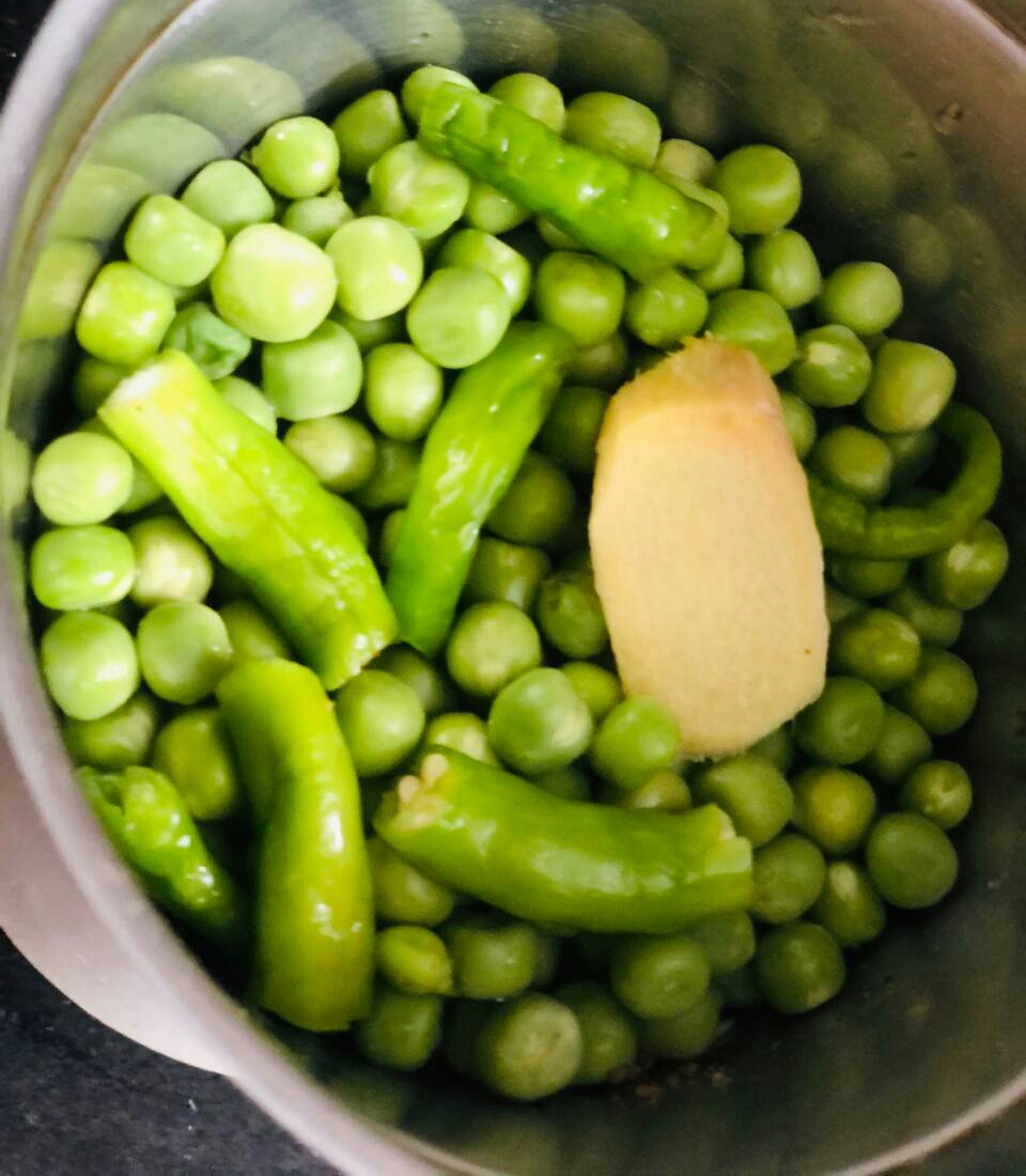| PUT GREEN PEAS, GREEN CHILLIES & GINGER IN A MIXER JAR |