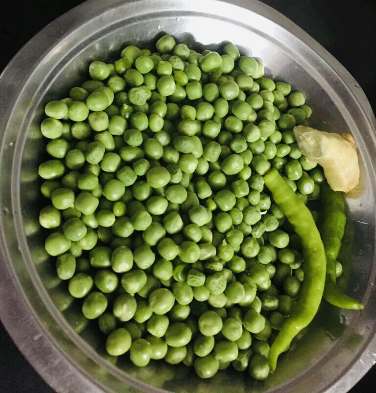 1) हरे मटर को धोकर एक छनी में रखें, ताकि मटर में से सारा पानी नितर जाऐ। अदरक, हरी मिर्च और हरा धनिया को भी धोकर रखें।
