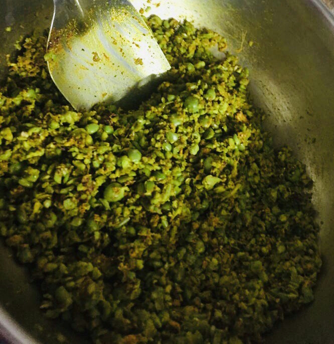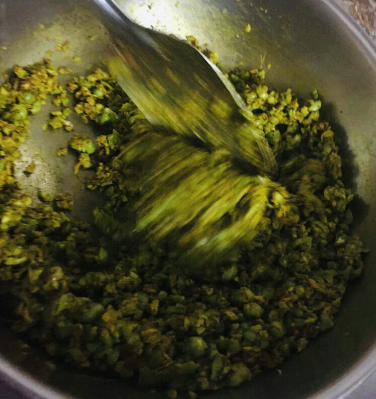| STIR THE MIXTURE CONTINUOUSLY TILL ALL THE SPICES MIX WELL WITH THE PEAS |