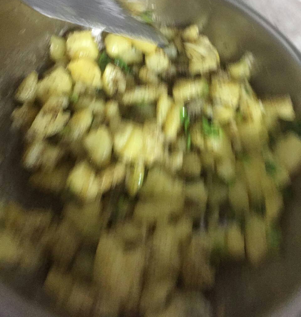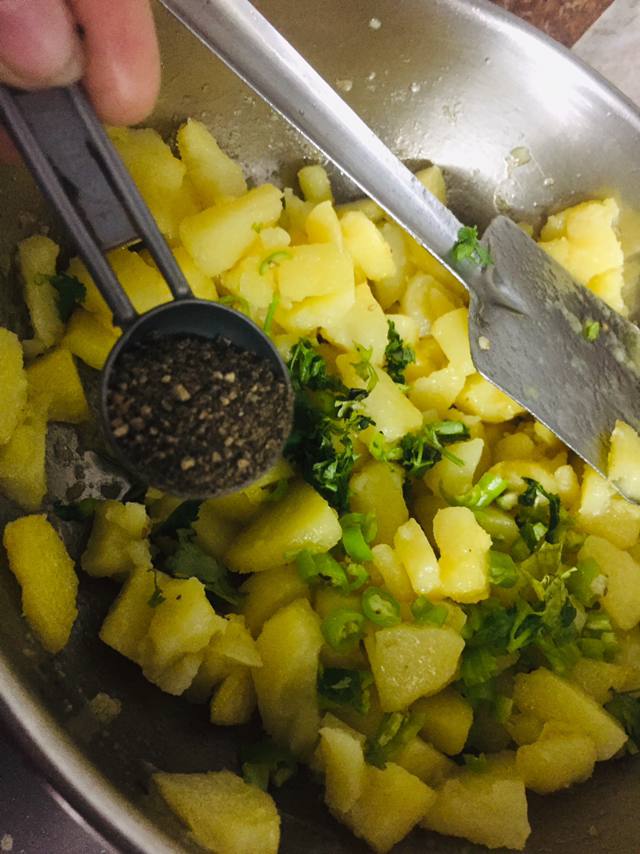 9) अब फ्राई किए आलू में बारीक कटी हुई हरी मिर्च aur बारीक कटा हुआ हरा धनिया ड़ाले।