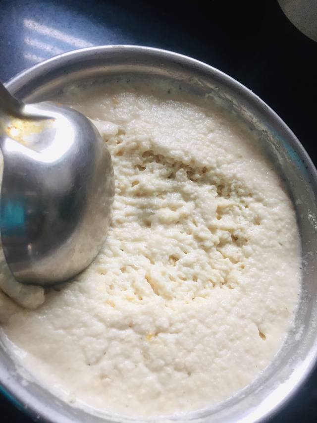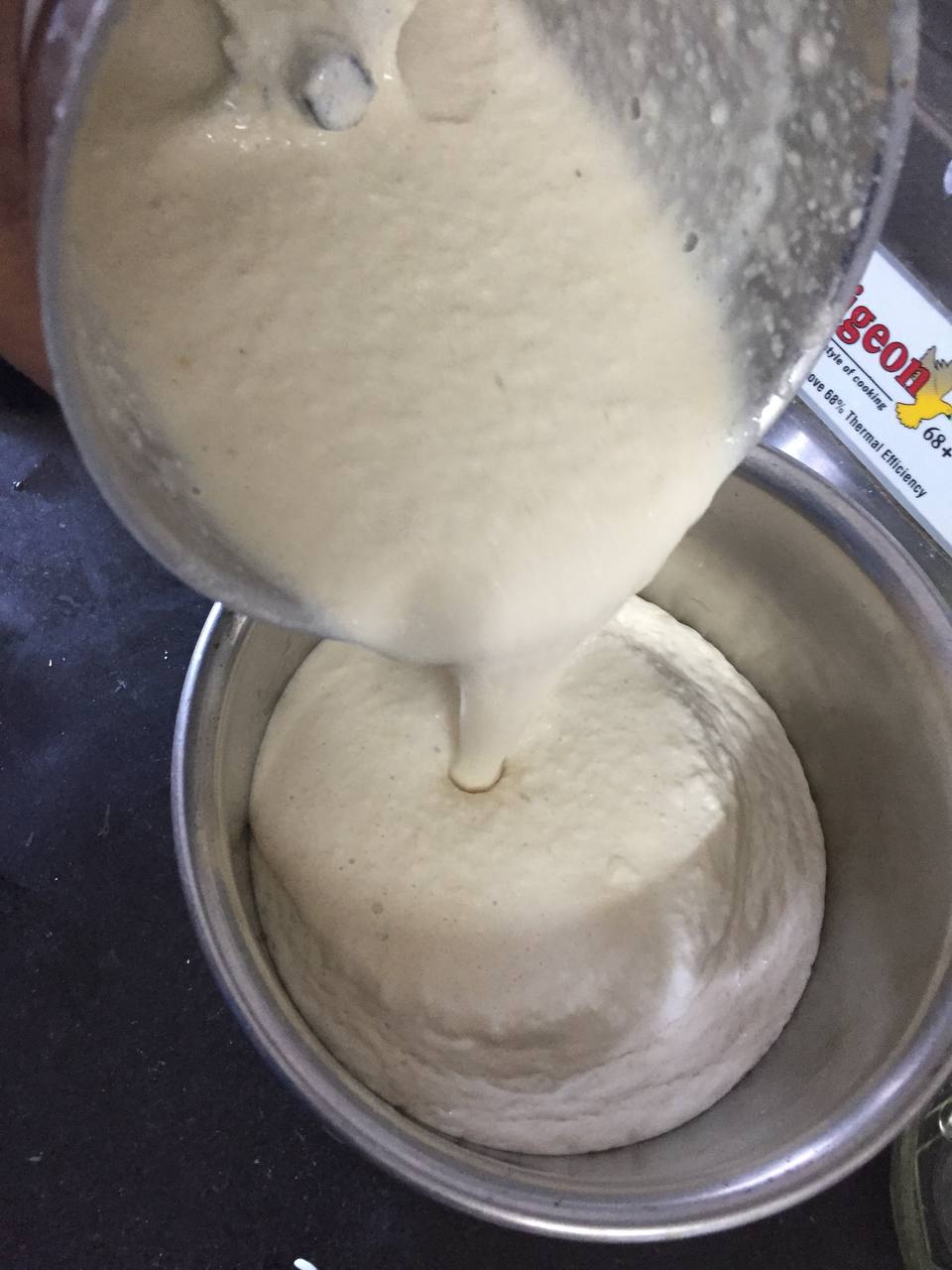 7) यह सारा पिसा हुआ मिश्रण एक गहरे भगोने या बड़े पतीले में डाले ।क्योंकि फरमेन्ट होने के बाद यह फूलकर दुगना हो जाएगा।