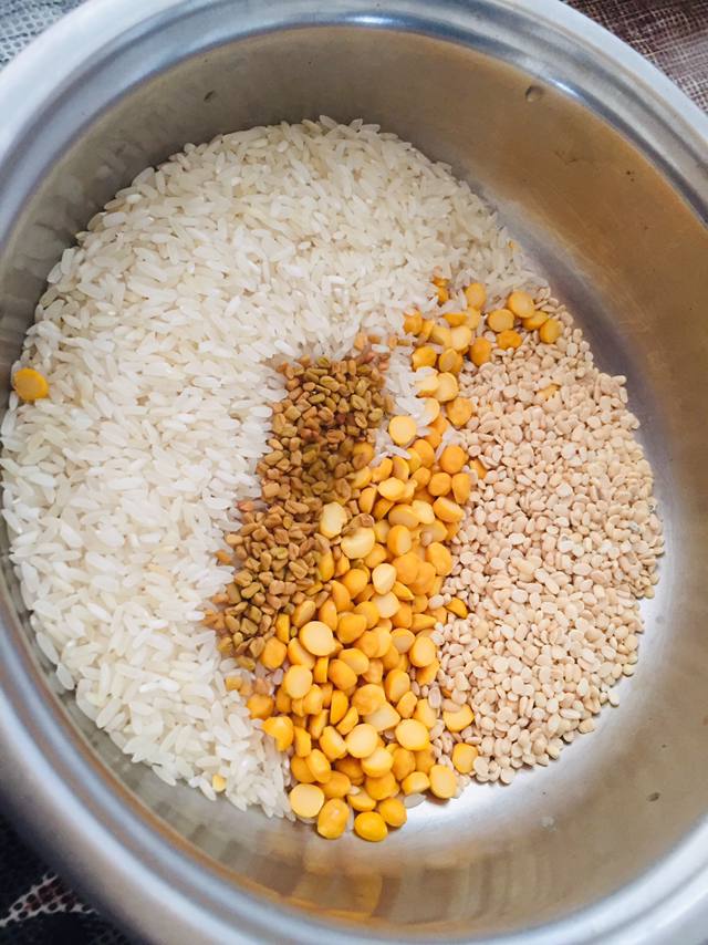 2) एक बडे पतीले में चावल, चना दाल, उड़द दाल और मेथी के दाने डालकर इन सभी चीजों को अच्छे से मिक्स करके 3 से 4 बार पानी से धो लीजिए, इसे 6 से 7 घण्टे या फिर पूरी रात के लिए पर्याप्त पानी में भिगोकर रखें।