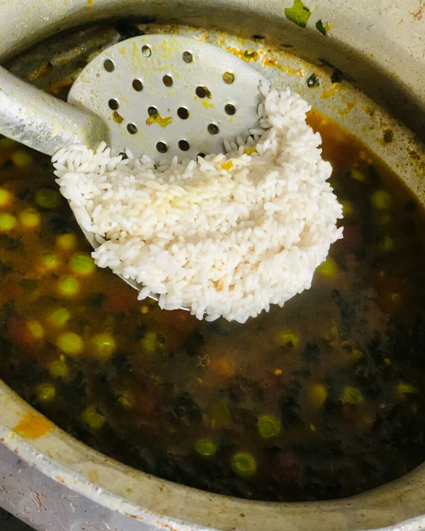 8) पानी में एक उबाल आने पर भिगोए हुए चावल डाल कर मिक्स कर ले।