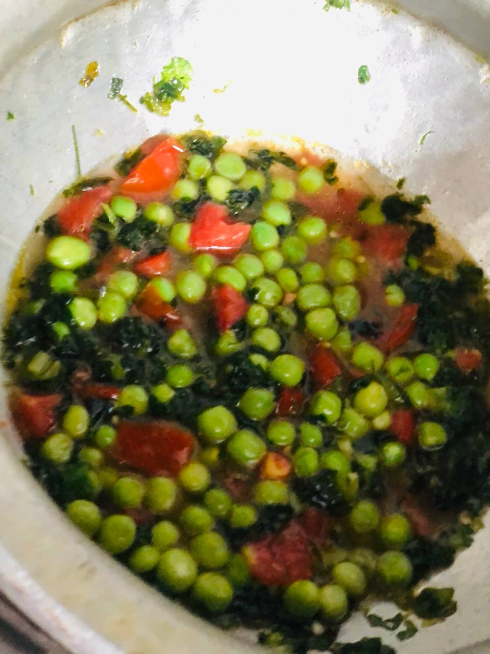 4) अब इसमें मटर और 2 tbsp पानी डालें और इसे तब तक पकाऐं कि जब तक टमाटर गलकर नरम ना हो जाए। (इस स्टेप पे तकरीबन 2 से 3 मिनट का समय लगेगा, गैस की आंच बिल्कुल धीमी ही रखें।)