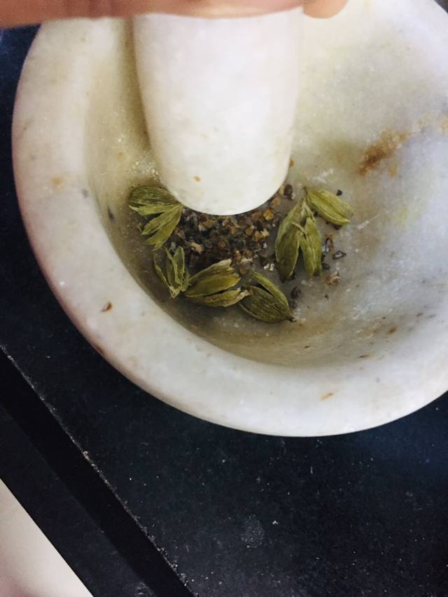 3) इलाईची को खलबते में कूट कर इसके छिलके हटा लीजिऐ।