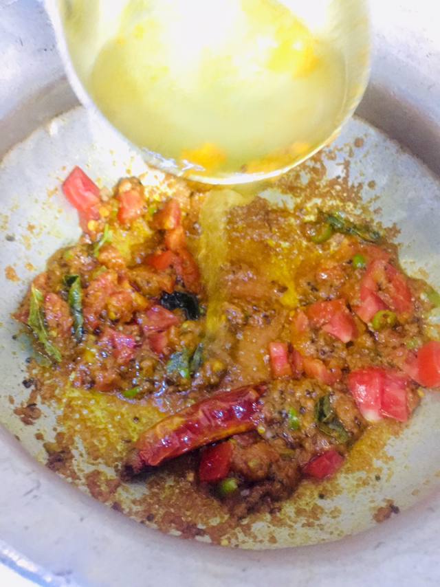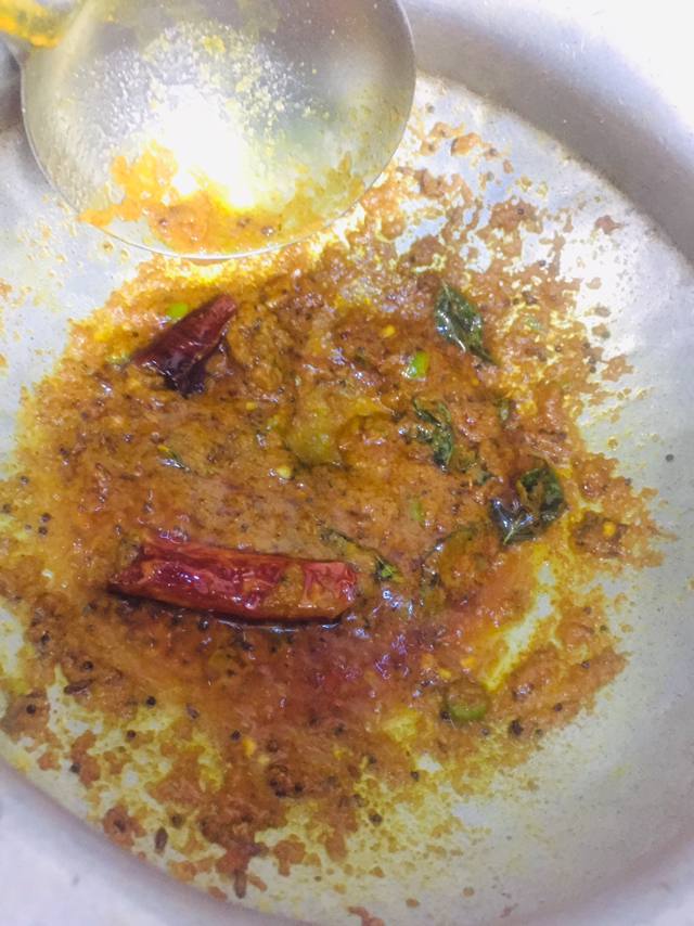 4) अब करी पत्ता और साबुत लाल मिर्च डालकर तुरंत ही मसालों से तैयार की हुई पेस्ट डालकर सतत चलाते हुए तब तक भुने कि जब तक मसालों के ऊपर तेल न तैरने लगें और मसाले दानेदार न हो जाए। (इस स्टेप पर लगभग 20 से 30 सेकन्ड का समय लगता है।)
