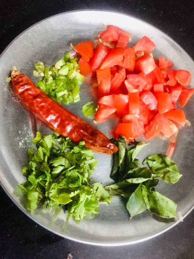 4) अब करी पत्ता और साबुत लाल मिर्च डालें हल्का सा भुन लीजिऐ।
