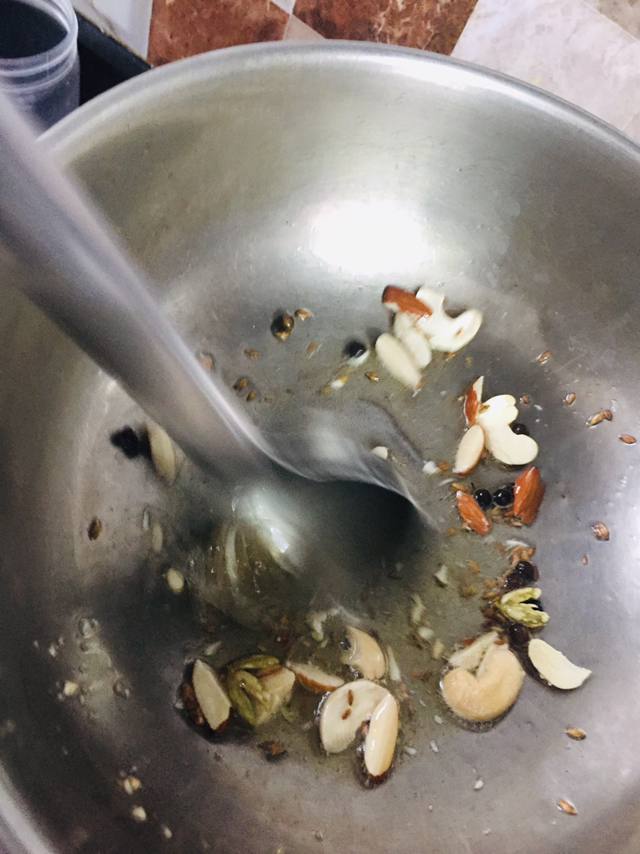 3) जीरा के हल्के ब्राउन होने पर कटे हुए काजू और बादाम ड़ाले और इन्हें भी 15 से 20 सेकण्ड तक भुने।