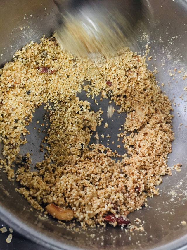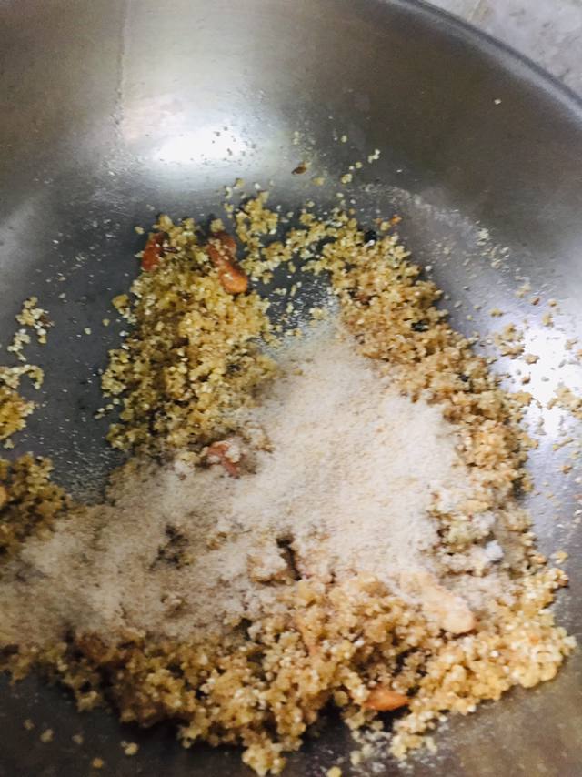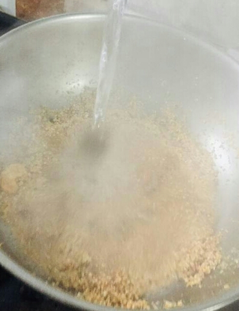 5) 2 मिनट के बाद दरदरा गैहूं का आटा ड़ालें।
