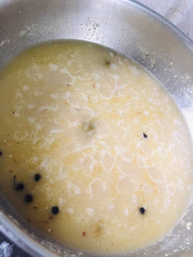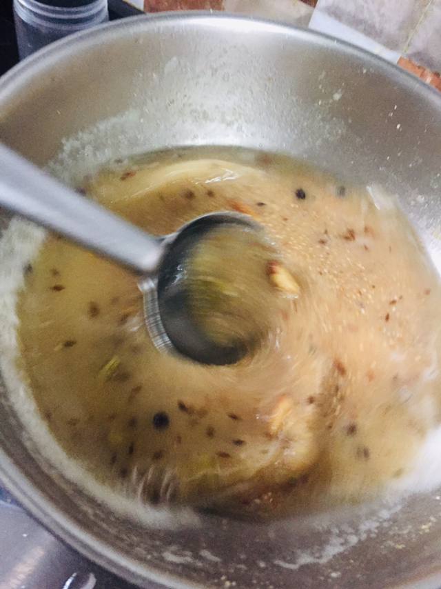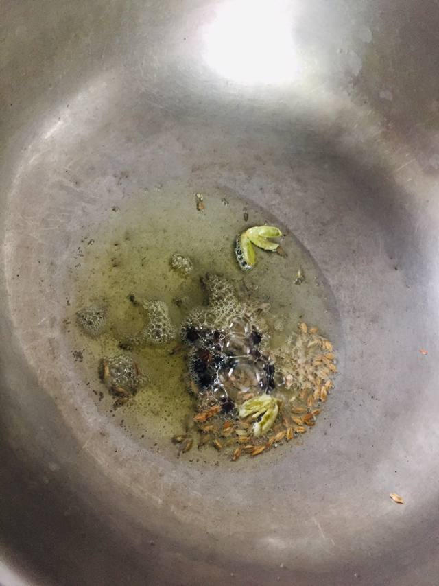 2) जब घी पिघलकर मध्यम गर्म हो जाऐ तब गैस की आंच धीमी कर दे, फिर इसमें इलाईची, जीरा और काली मिर्च डालें और जीरा के हल्के ब्राउन होने तक भुने।