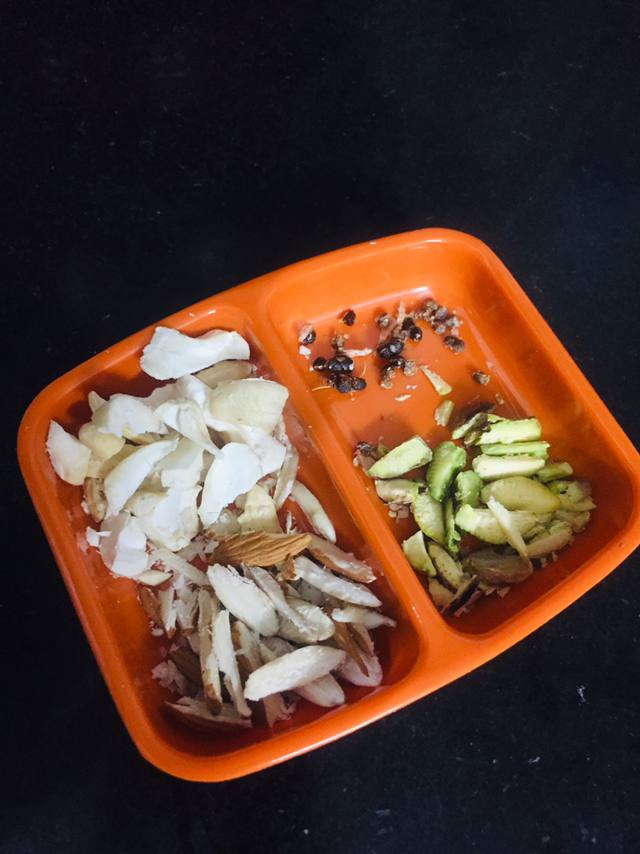 2) dry fruit को बारीक कतरन में काट लीजिऐ, इलाईची को भी कूट लें और इसके छिलके हटा दीजिऐ।