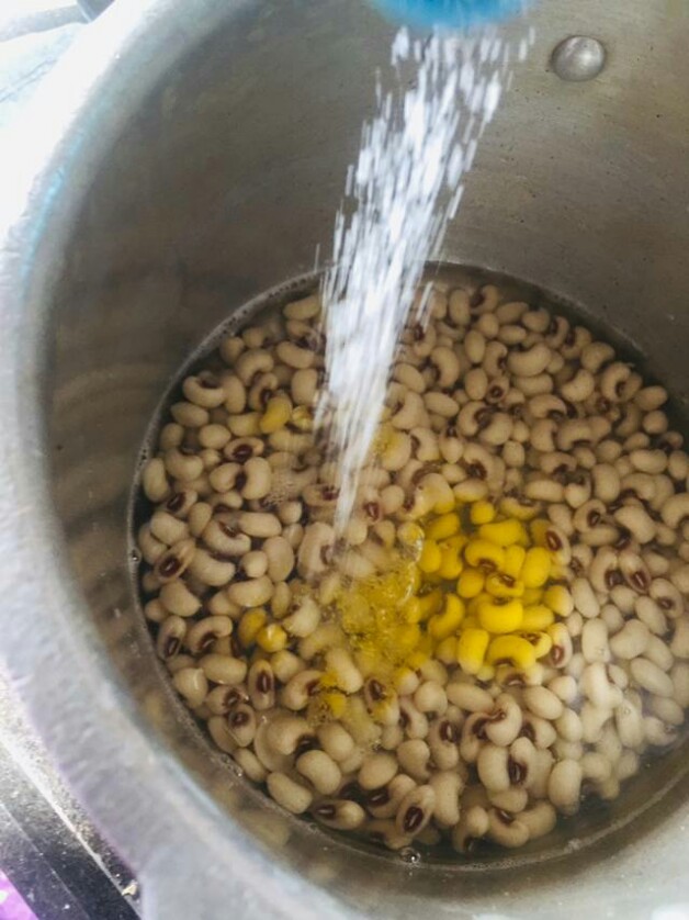 1) 2 घंटे बाद एक प्रेशर कुकर में भिगोऐ हुए लोबिया, 3 कप पानी, नमक और 1 टीस्पून सरसों का तेल डाले और कुकर को ढक्कन लगाकर तेज आंच पर 2 whistle और धीमी आंच पर 1 सीटी आने तक पकाए, फिर गैस बंद कर दीजिए। a.