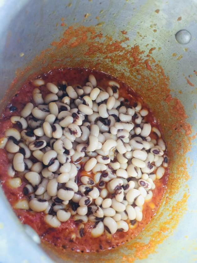 7) जैसे ही मिश्रण के ऊपर तेल तैरने लगे उबले हुए लोबिया ड़ाले।
