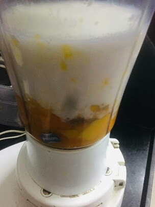 4) इन्हें अच्छी तरह ब्लेंड कर लें।(सुनिश्चित करें कि कोई एकाद आम के टुकड़े न रहे जाने चाहिऐ।)