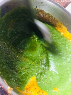 4) 40 सेकन्ड के बाद इसमें पालक की प्यूरी डालकर इसे बेसन के मिश्रण के साथ अच्छी तरह mix कर लीजिऐ।