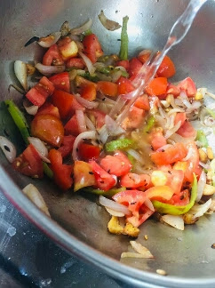 5) जब प्याज़ हल्का सा ब्राउन हो जाए तब कटे हुए टमाटर और 1 कप पानी डालकर मिक्स कर लें चमच्च से लगातार चलाते हुए 2 मिनट तक पकाऐं।