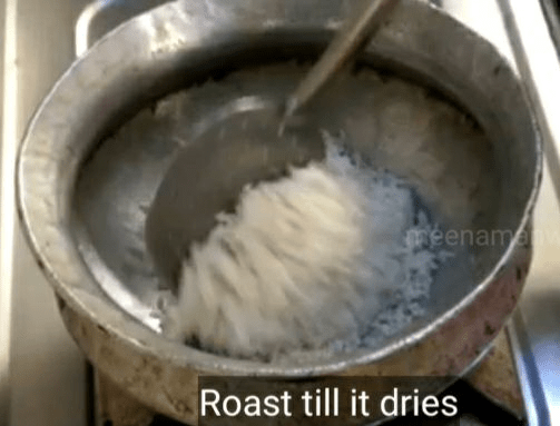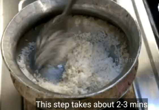 5. अब उसी हांडी में धुले हुए चावल डालें और इन्हें भी चलाते हुए तब तक भुने की ज़ब तक इनका पानी सूख न जाए। (इस स्टेप में लगभग 2 से 3 मिनिट का समय लग सकता है।