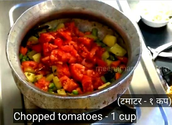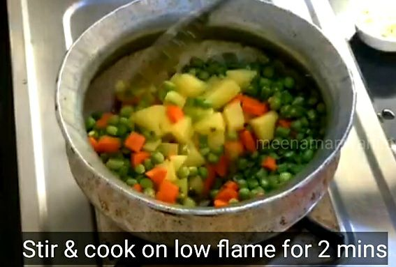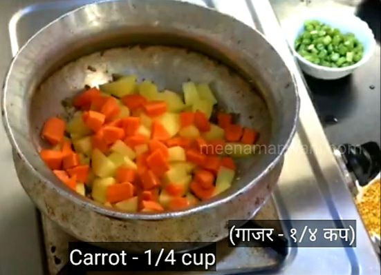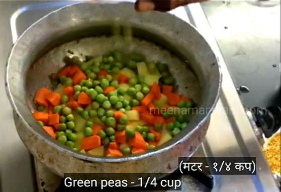7. अब कटे हुए आलू, कटी हुई गाजर, मटर और बिन्स डालें।
