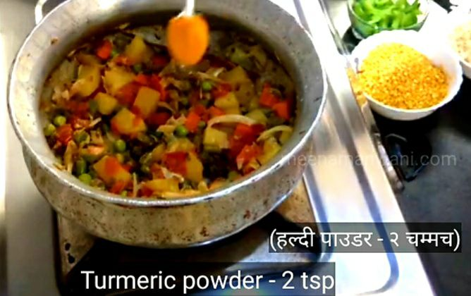 11. 3 मिनट के बाद हल्दी पाउडर डालकर मिक्स कर दीजिए।